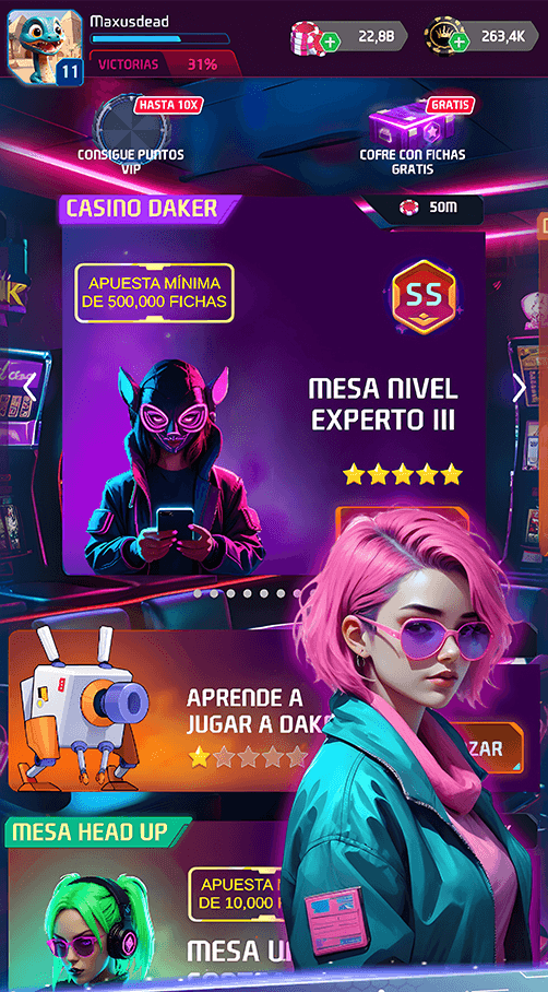 Podrás disfrutar de partidas multijugador donde jugar con otros jugadores de todo el mundo y demostrar tus habilidades en el Daker póker.